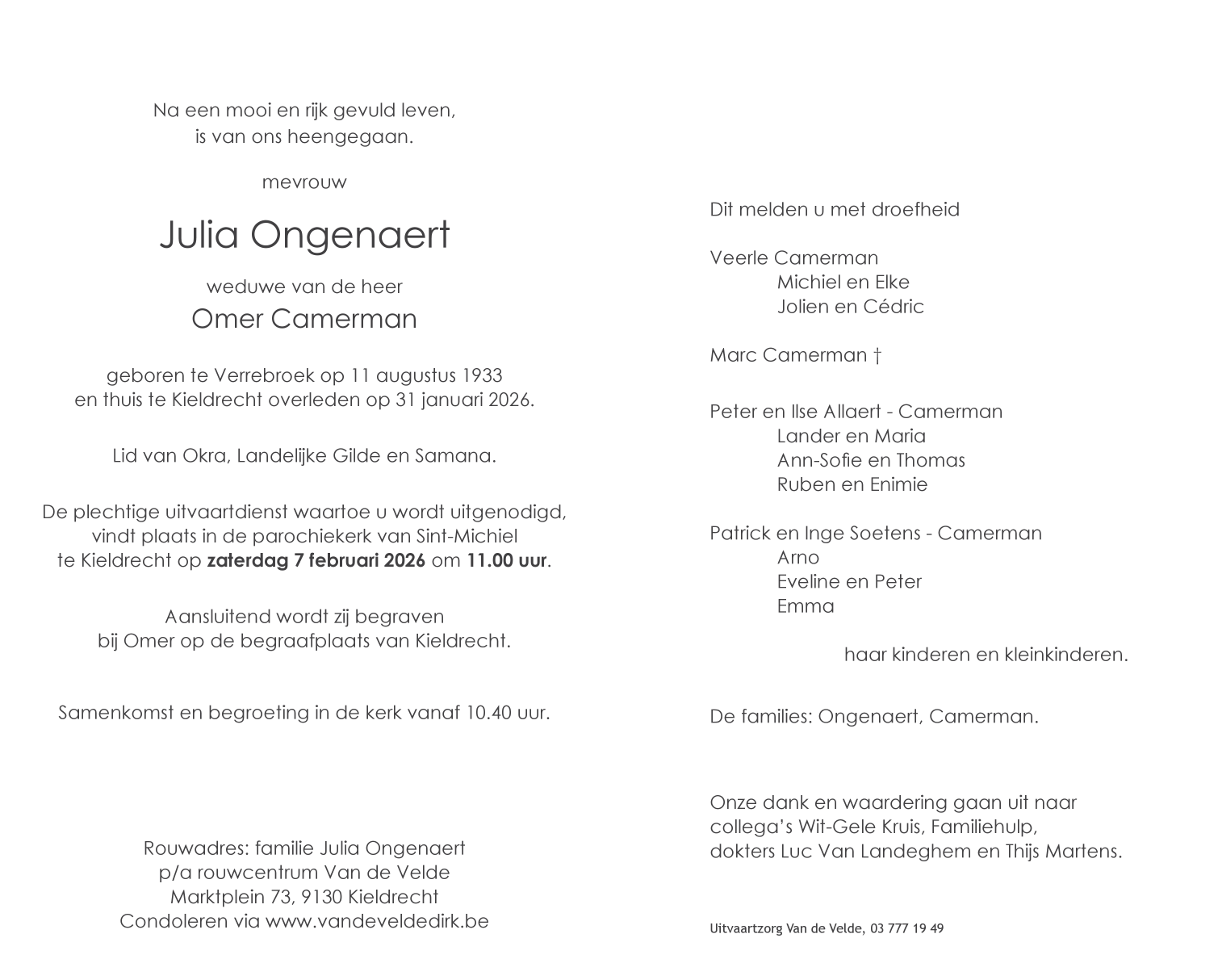 Died in Kieldrecht (Beveren) (9130) on 31 January 2026 at the age of 92 years