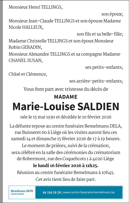 Décédée à Liège (4020) le mardi 10 février 2026 à l'âge de 95 ans