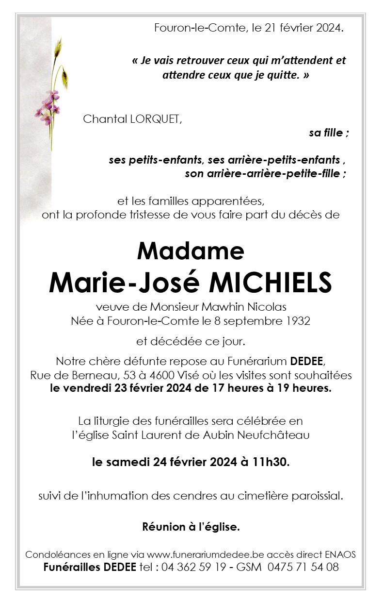 Died in Fouron-le-Comte (3798) on 21 February 2024 at the age of 91 years