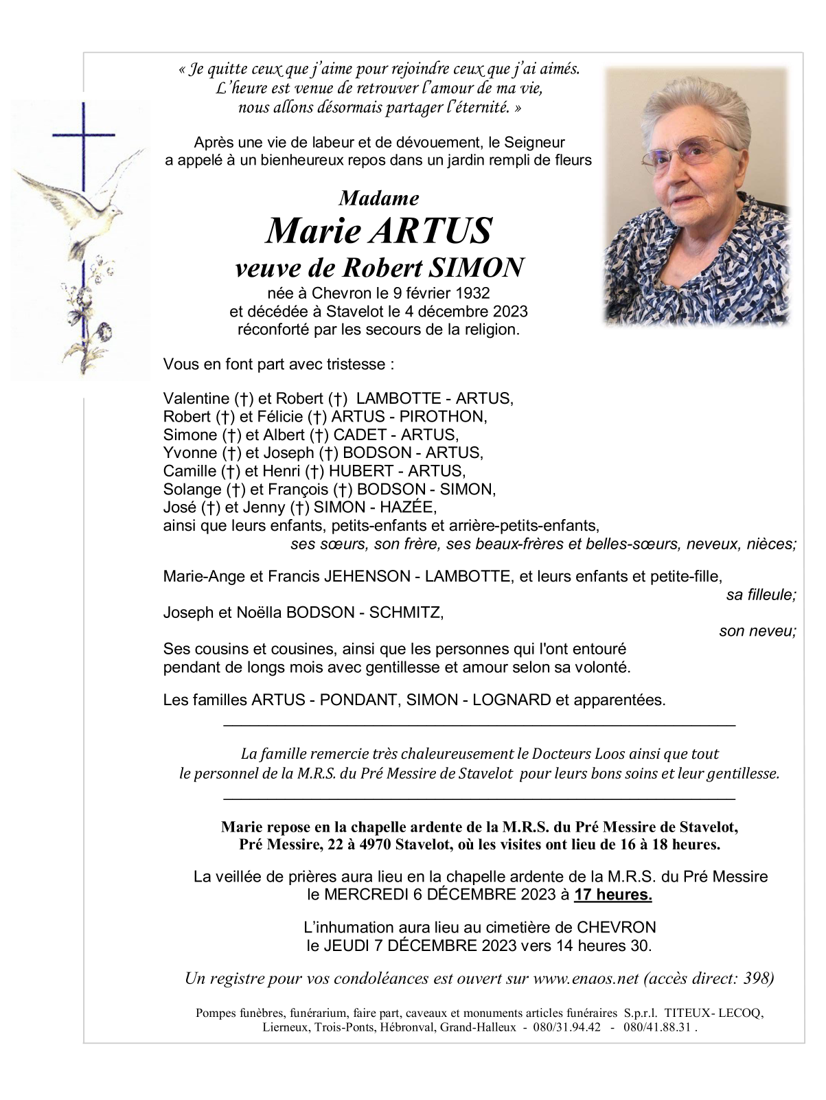 Overleden te Stavelot (4970) op maandag 4 december 2023 op 91-jarige leeftijd