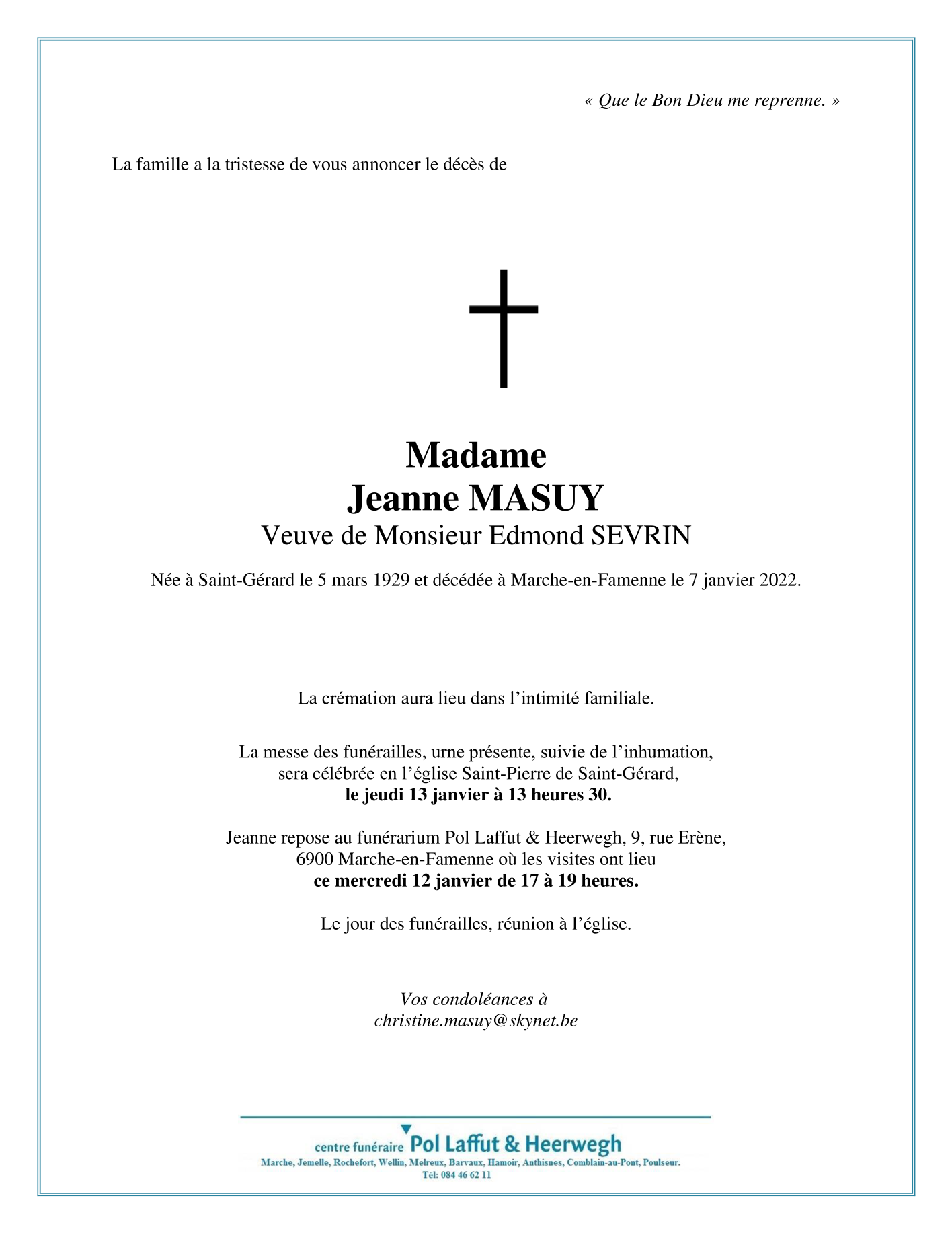 Fallecida en Marche-en-Famenne (6900) el viernes, 7 de enero de 2022 a la edad de 92 años