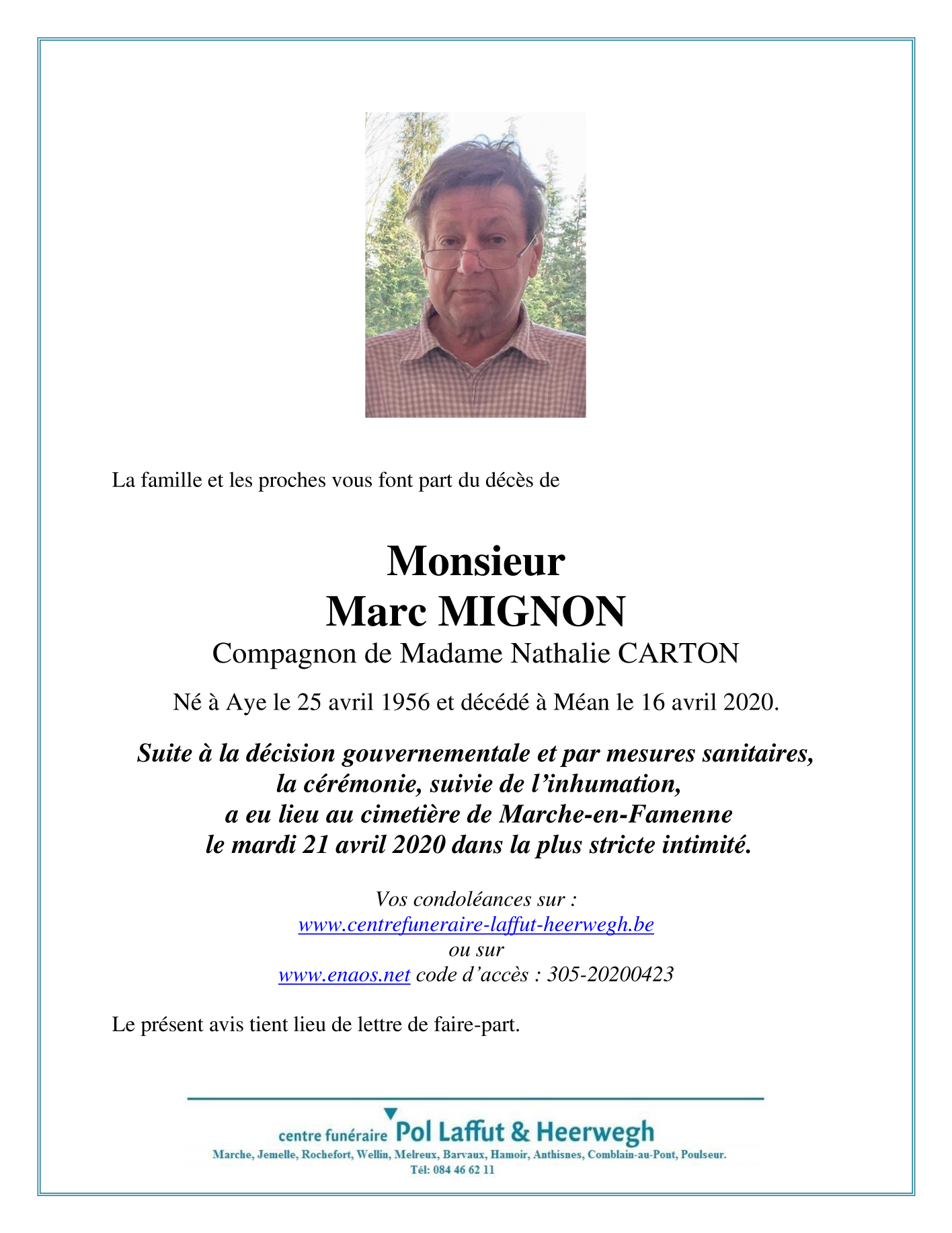 Fallecido en Méan (5372) el jueves, 16 de abril de 2020 a la edad de 63 años
