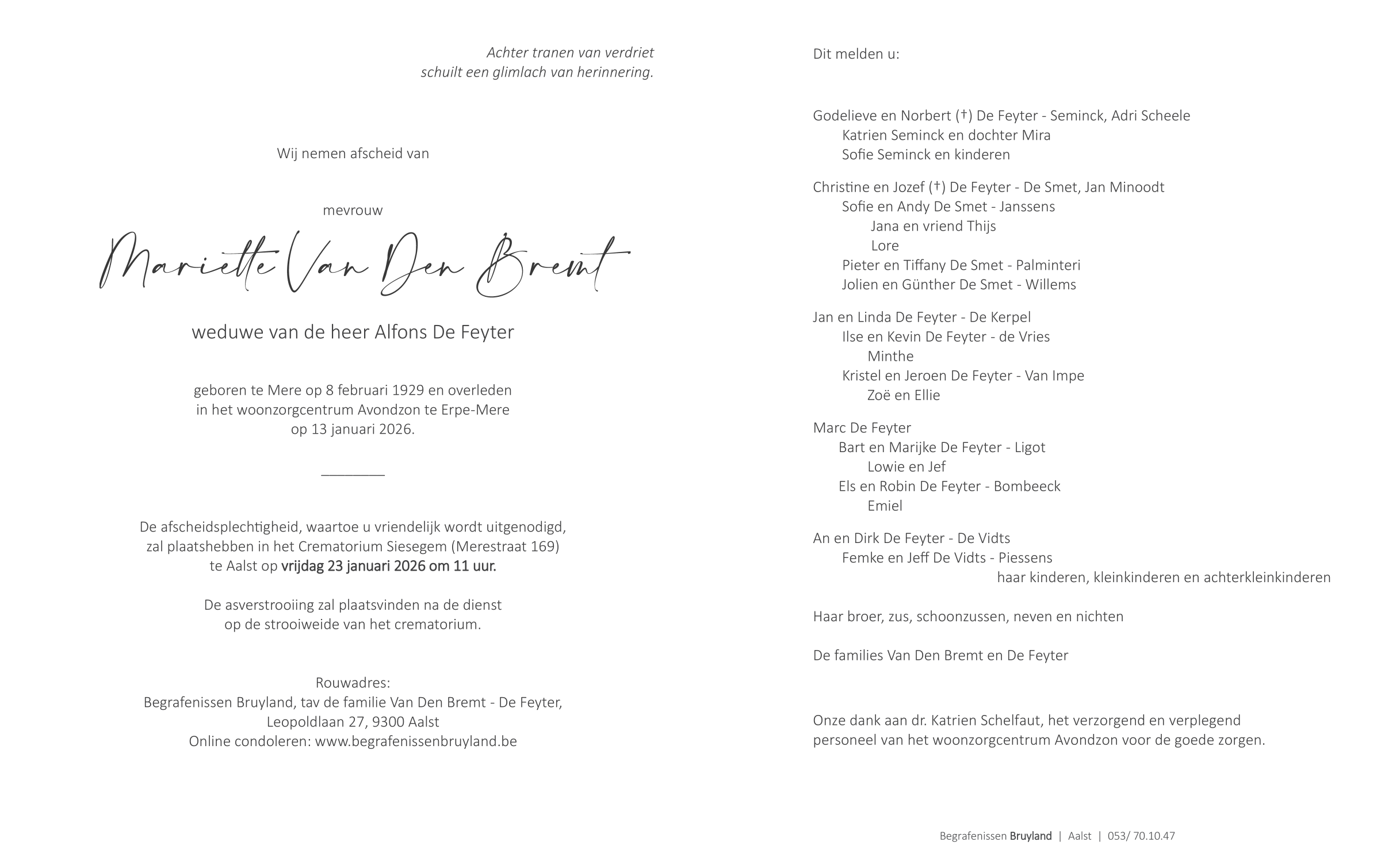 Décédée à Mere (9420) le mardi 13 janvier 2026 à l'âge de 96 ans