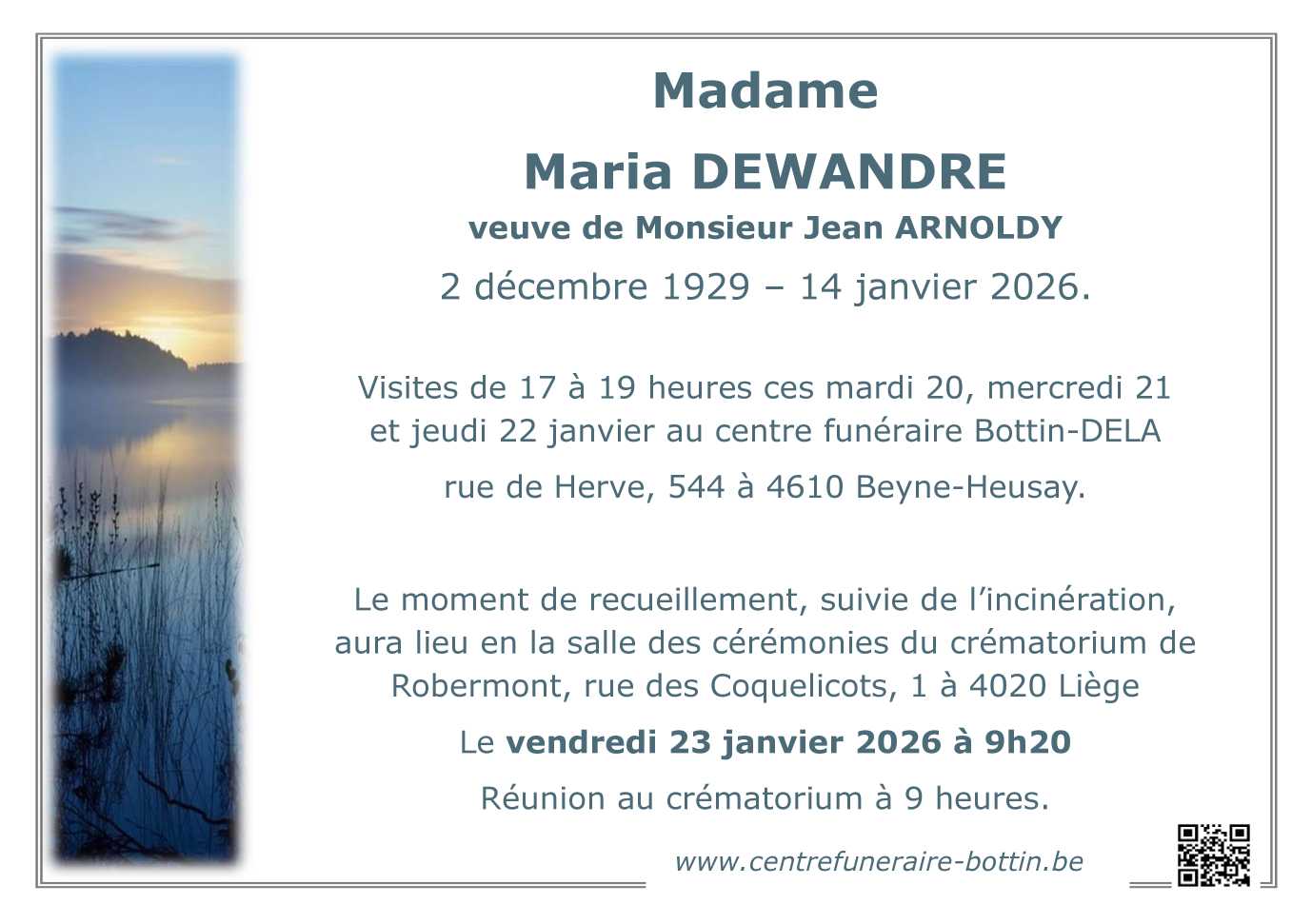 Décédée à Nandrin (4550) le mercredi 14 janvier 2026 à l'âge de 96 ans