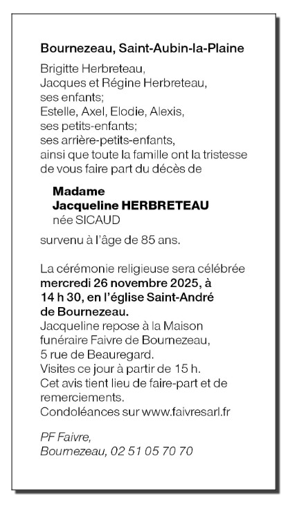 Décédée à Bournezeau (85480, France) le samedi 22 novembre 2025 à l'âge de 85 ans