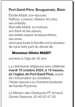 Décédé à Port-Saint-Père (44710, France) le jeudi 10 octobre 2024 à l'âge de 42 ans