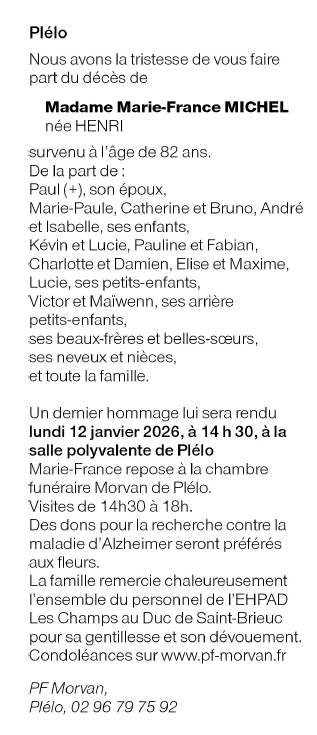Décédée à Saint-Brieuc (22000, France) le mercredi 7 janvier 2026 à l'âge de 82 ans