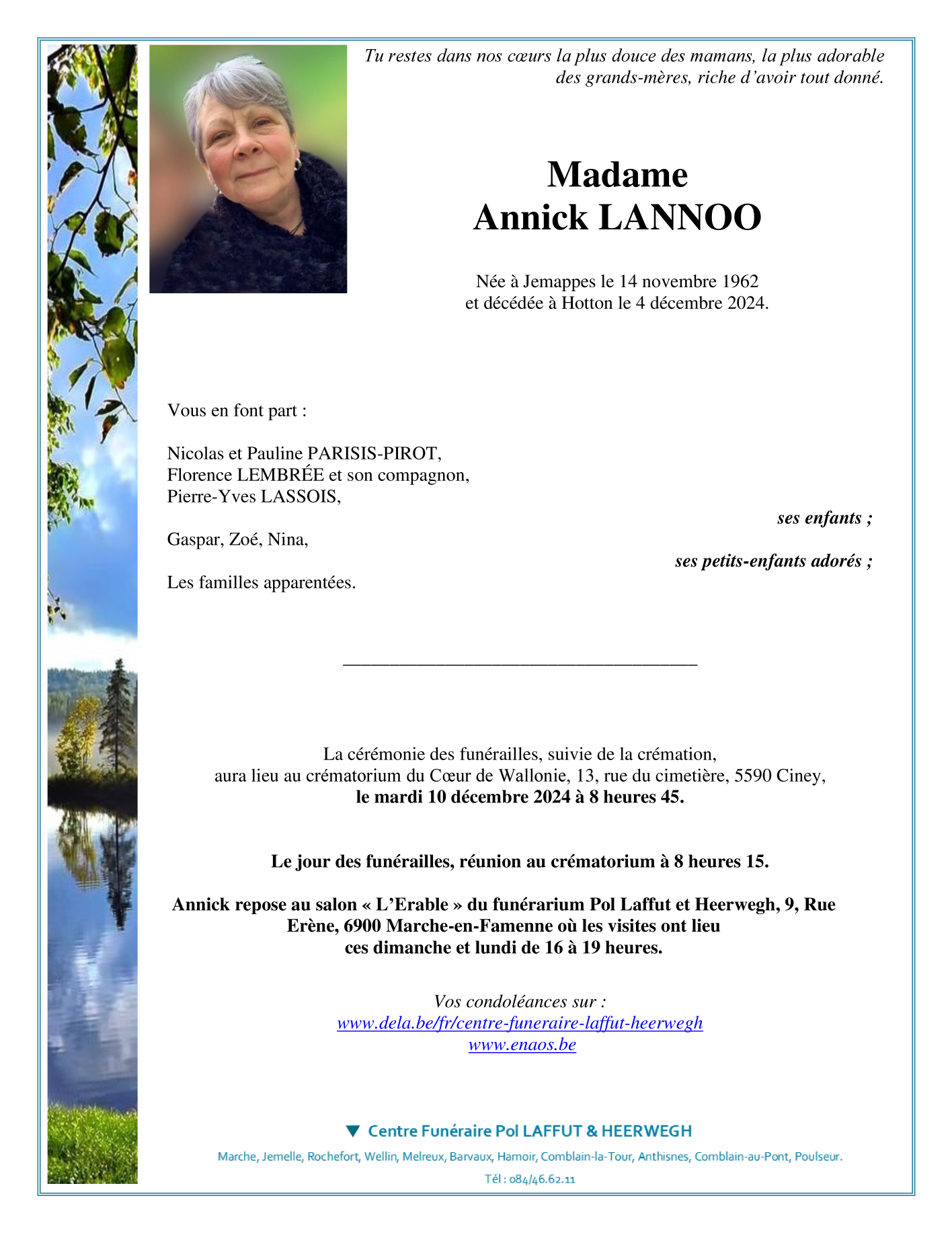Décédée à Hotton (6990) le mercredi 4 décembre 2024 à l'âge de 62 ans