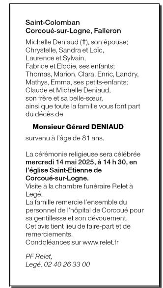 Décédé à Corcoué-sur-Logne (44650, France) le samedi 10 mai 2025 à l'âge de 81 ans