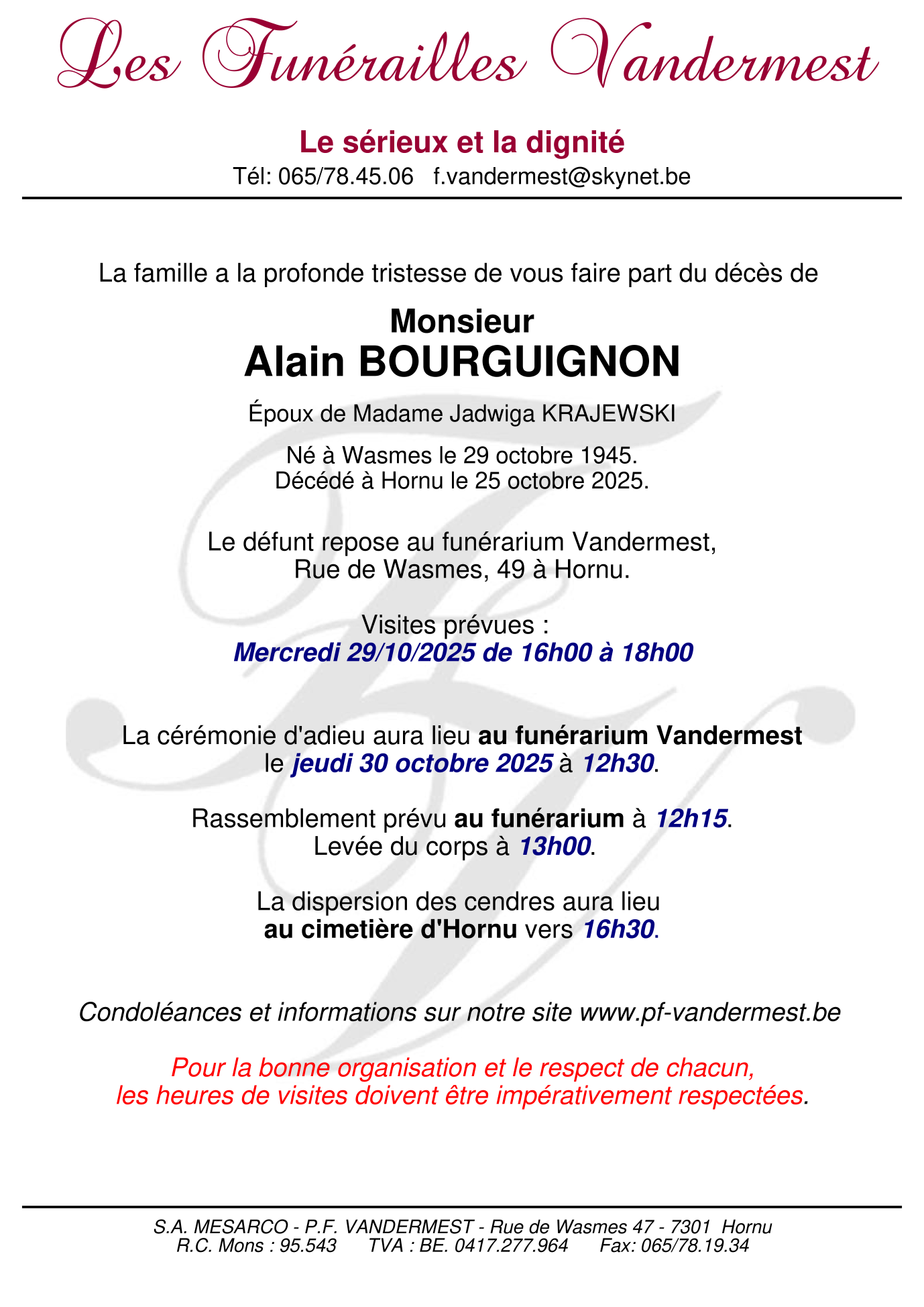Fallecido en Hornu (7301) el sábado, 25 de octubre de 2025 a la edad de 79 años
