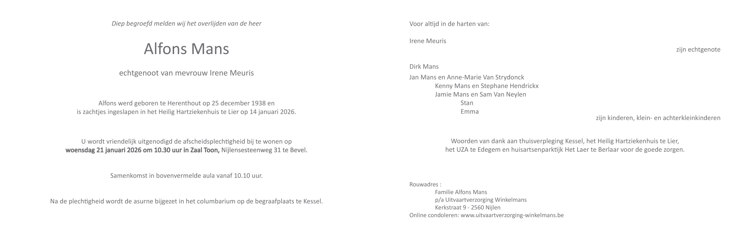 Décédé à Lier (2500) le mercredi 14 janvier 2026 à l'âge de 87 ans