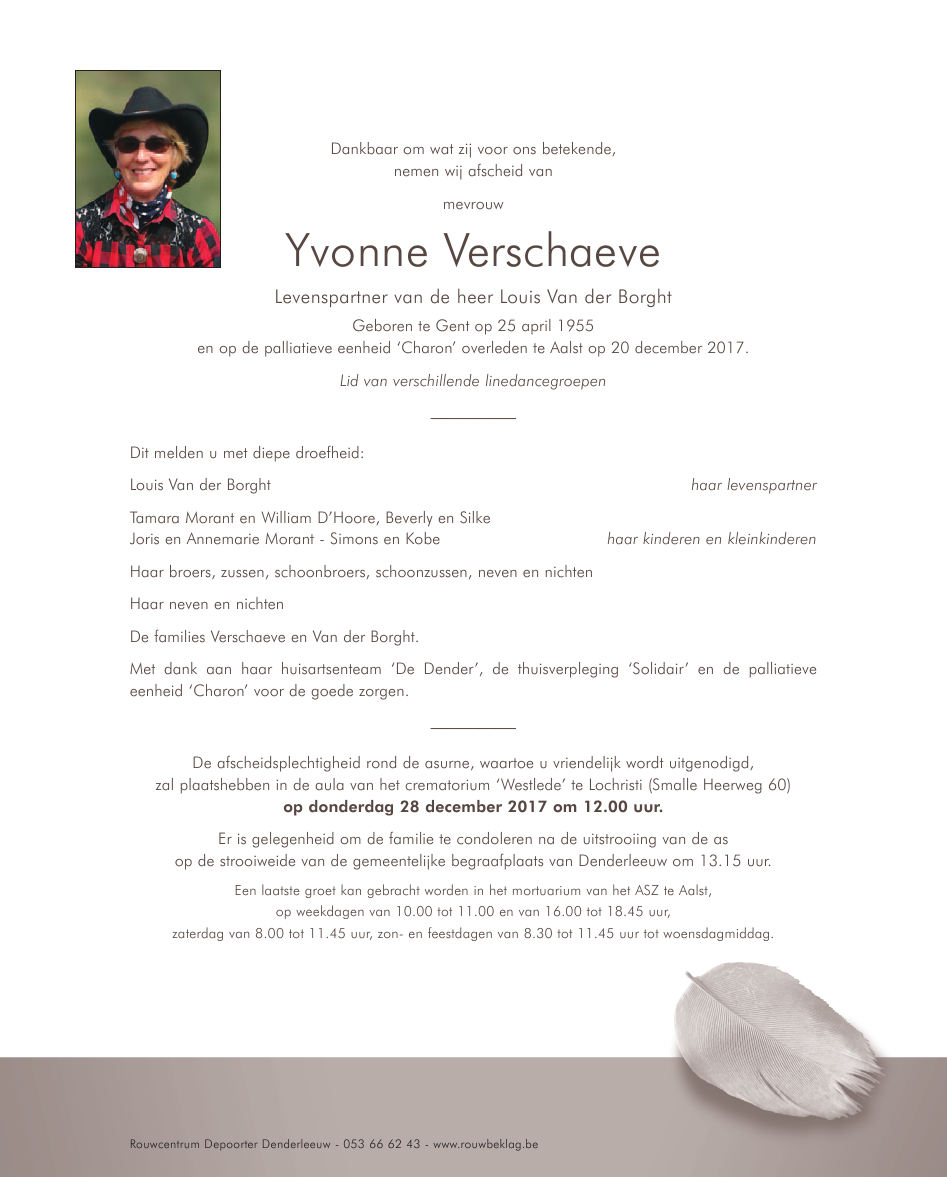 Fallecida en Aalst (9300) el miércoles, 20 de diciembre de 2017 a la edad de 62 años