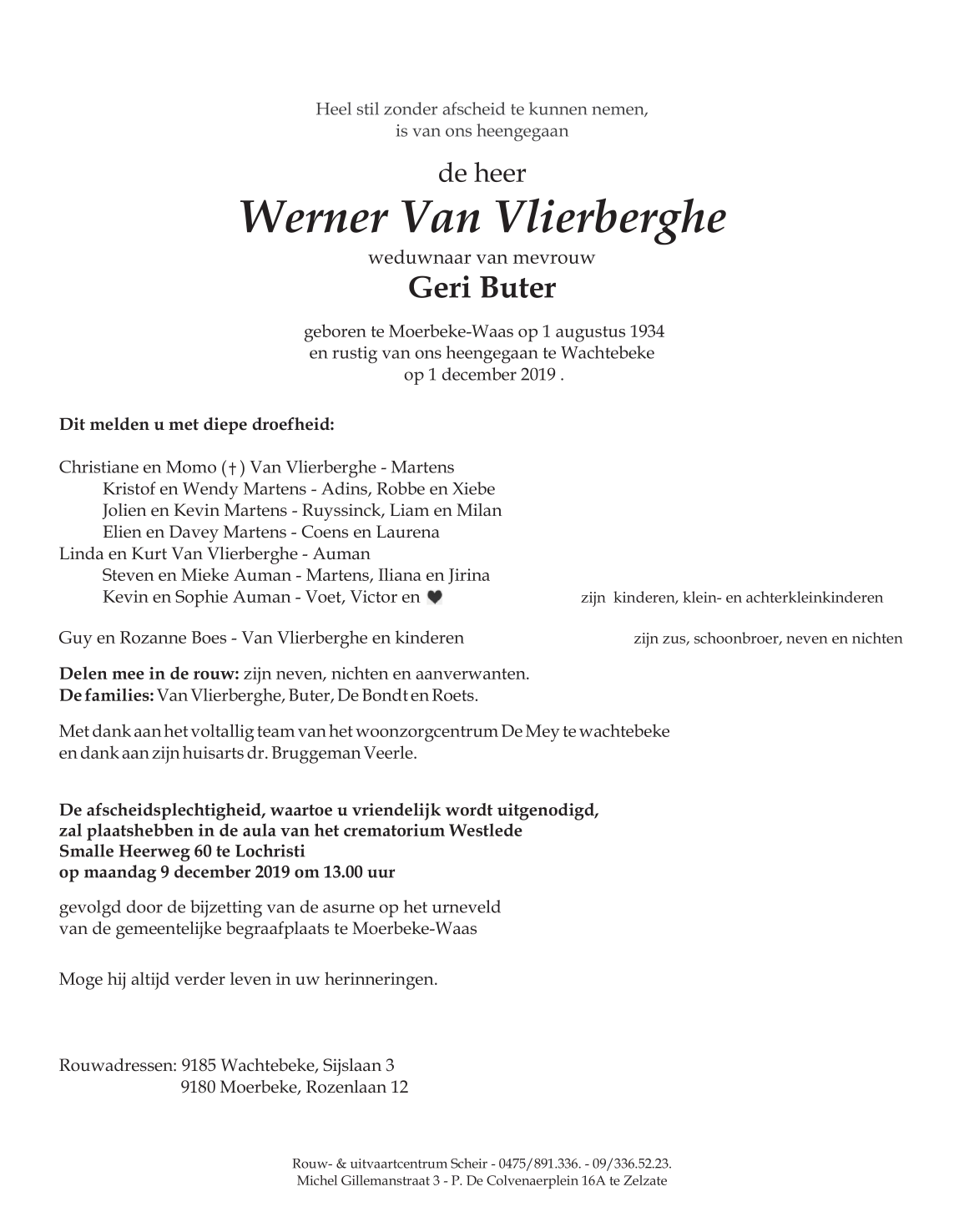 Décédé à Wachtebeke (9185) le dimanche 1 décembre 2019 à l'âge de 85 ans