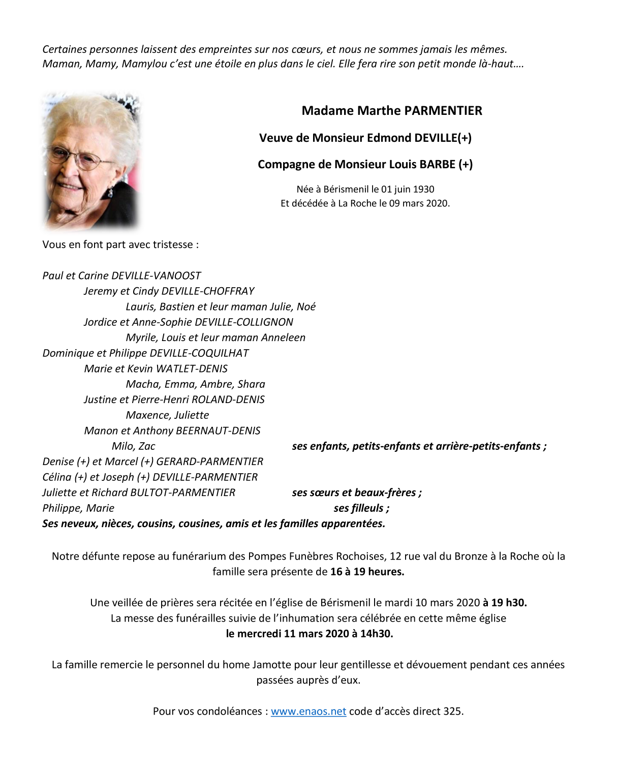 Fallecida en La Roche-en-Ardenne (6980) el lunes, 9 de marzo de 2020 a la edad de 89 años