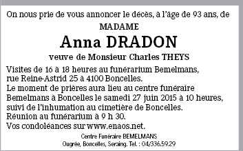 Décédée à Ougrée (4102) le mercredi 24 juin 2015 à l'âge de 93 ans