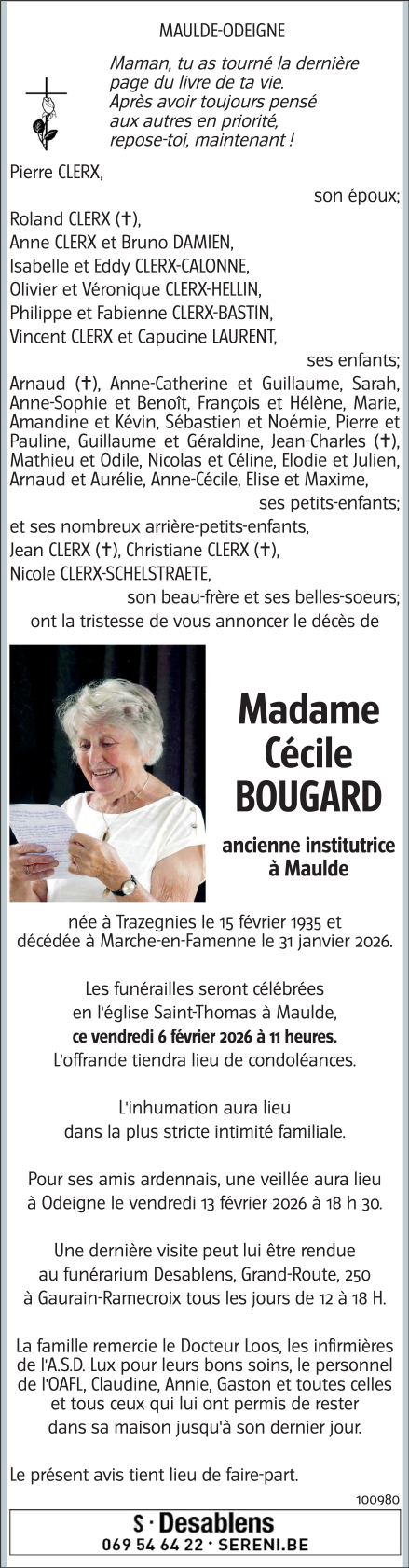 Décédée à Marche-en-Famenne (6900) le samedi 31 janvier 2026 à l'âge de 90 ans