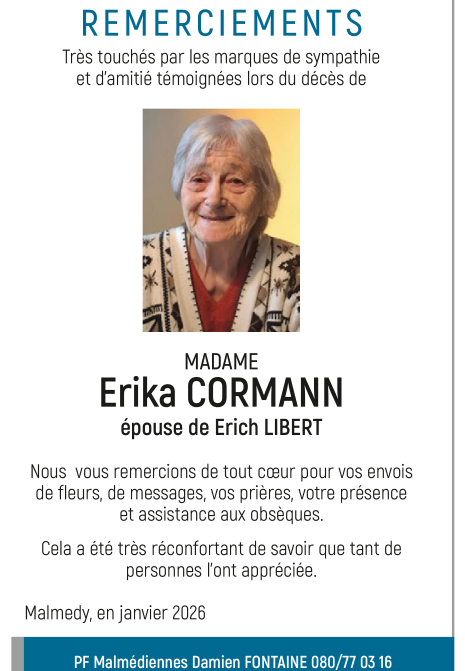 Décédée à Malmedy (4960) le mardi 20 janvier 2026 à l'âge de 83 ans