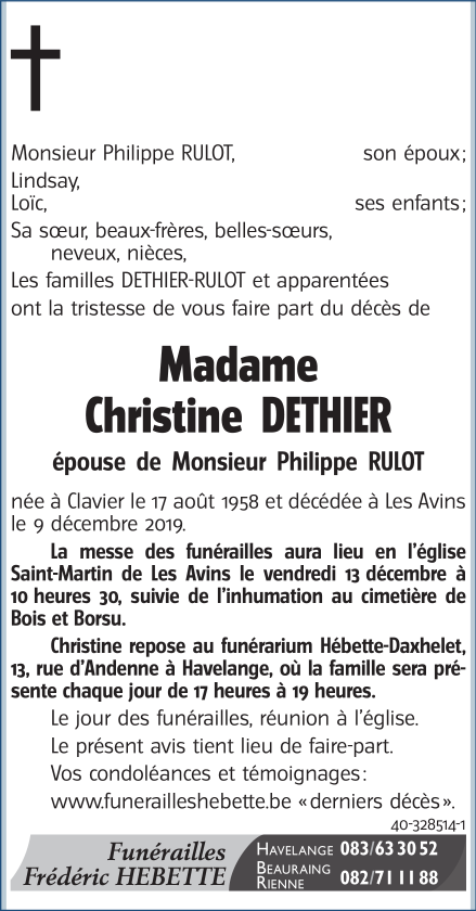 Fallecida en Les Avins (4560) el lunes, 9 de diciembre de 2019 a la edad de 61 años
