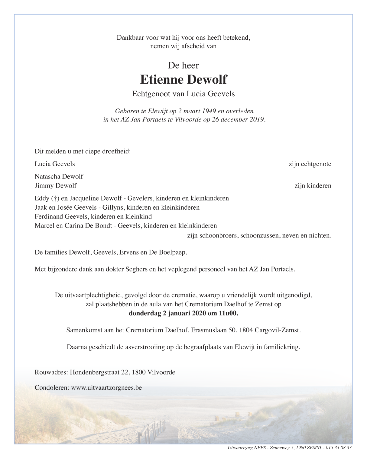 Fallecido en Vilvoorde (1800) el jueves, 26 de diciembre de 2019 a la edad de 70 años