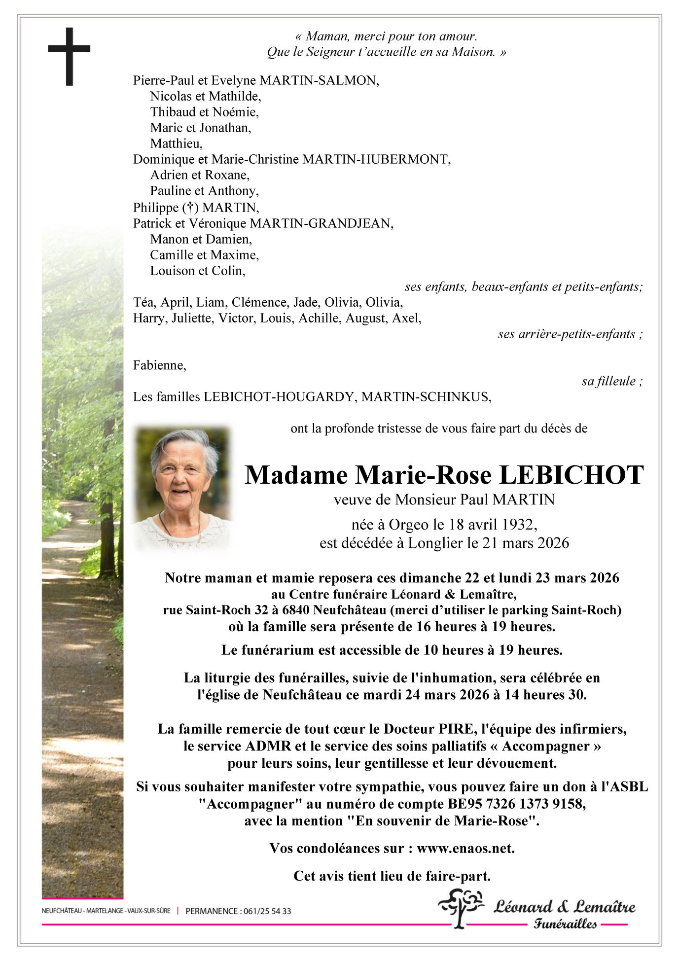 Décédée à Longlier (6840) le samedi 21 mars 2026 à l'âge de 93 ans