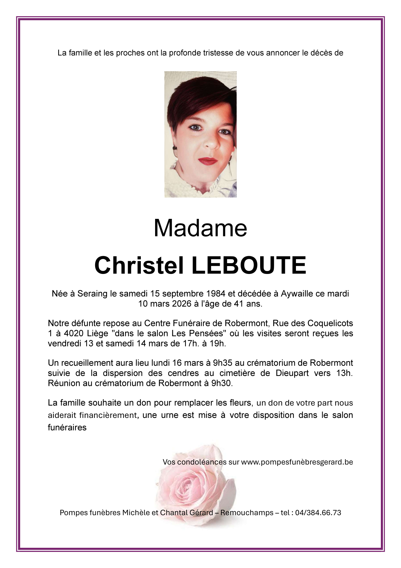 Décédée à Aywaille (4920) le mardi 10 mars 2026 à l'âge de 41 ans