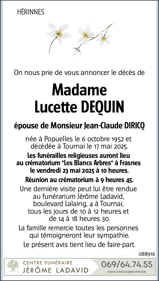Fallecida en Tournai (7500) el sábado, 17 de mayo de 2025 a la edad de 72 años