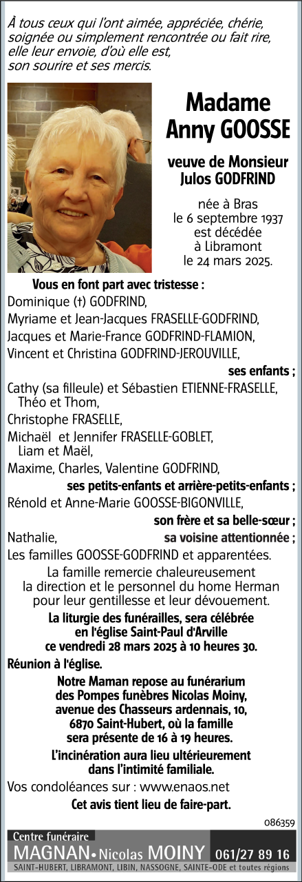 Décédée à Libramont (6800) le lundi 24 mars 2025 à l'âge de 87 ans