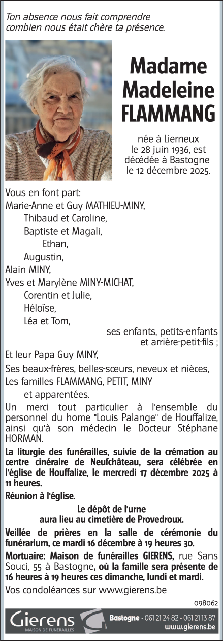Décédée à Bastogne (6600) le vendredi 12 décembre 2025 à l'âge de 89 ans