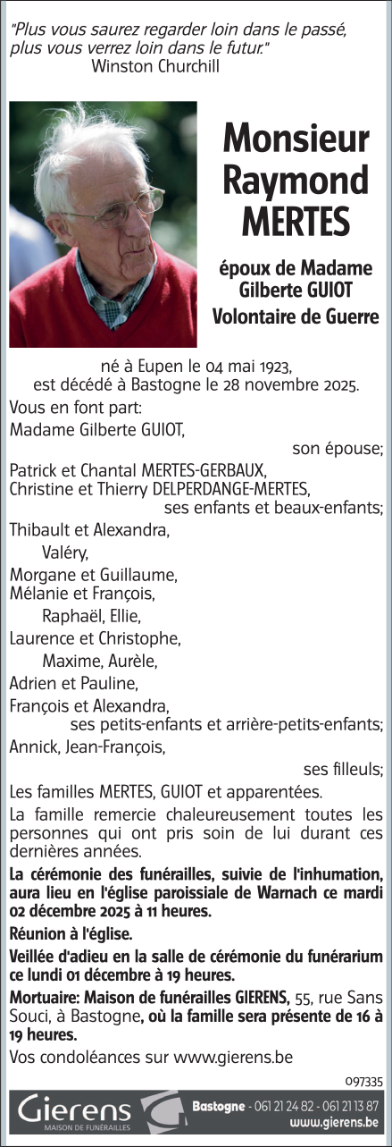 Décédé à Bastogne (6600) le vendredi 28 novembre 2025 à l'âge de 102 ans