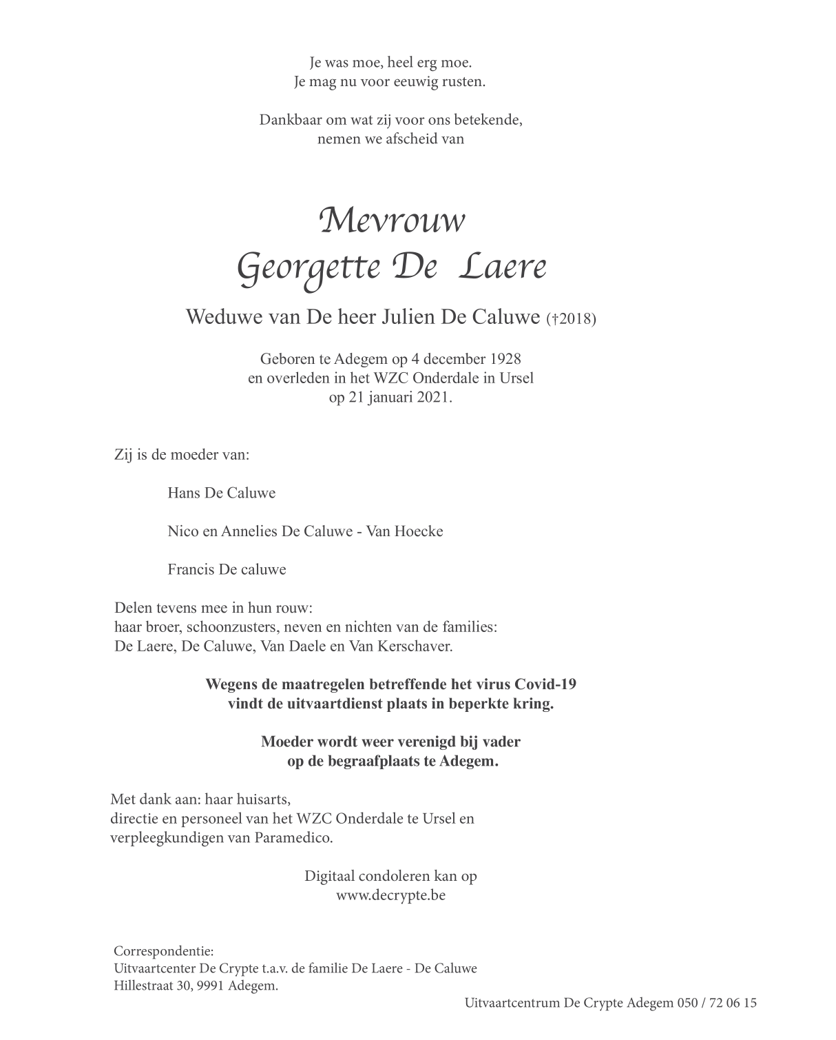 Décédée à Ursel (9910) le jeudi 21 janvier 2021 à l'âge de 92 ans