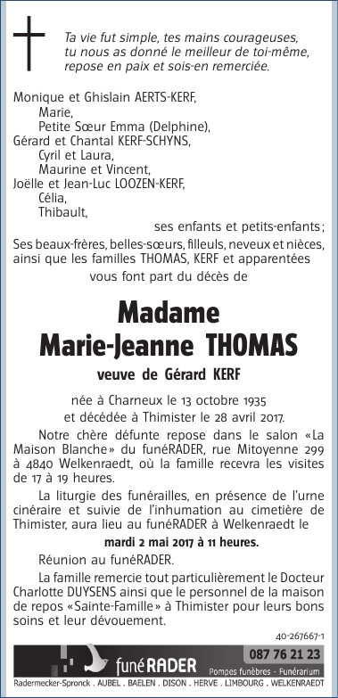 Décédée à Thimister (4890) le vendredi 28 avril 2017 à l'âge de 81 ans