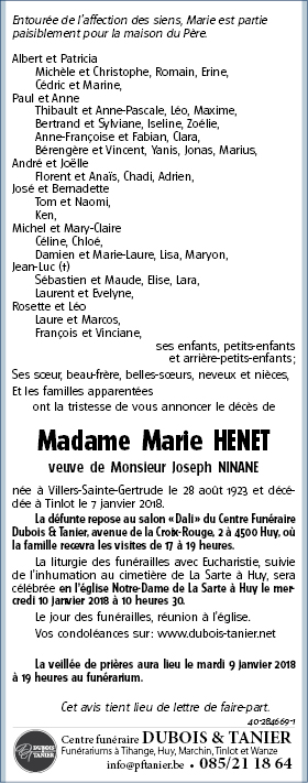 Décédée à Tinlot (4557) le dimanche 7 janvier 2018 à l'âge de 94 ans