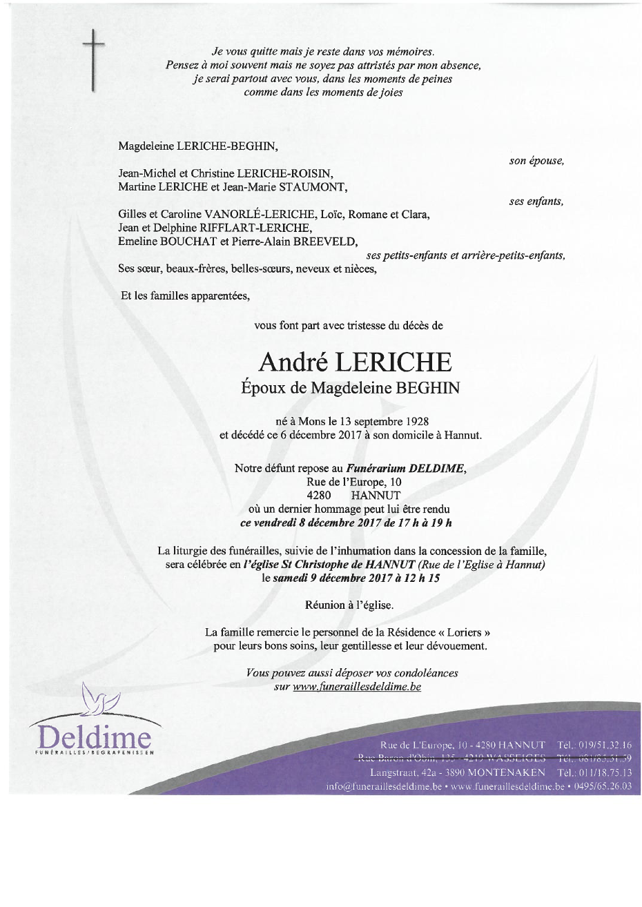 Fallecido en Hannut (4280) el miércoles, 6 de diciembre de 2017 a la edad de 89 años