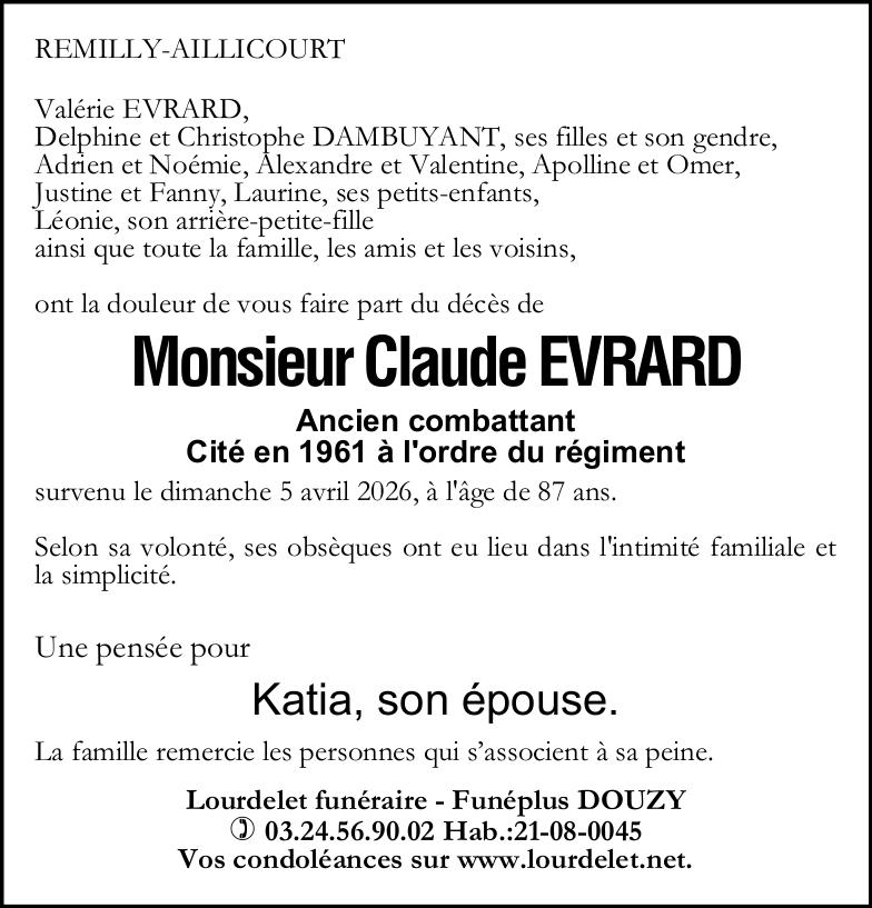 Décédé à Sedan (08200, France) le dimanche 5 avril 2026 à l'âge de 87 ans