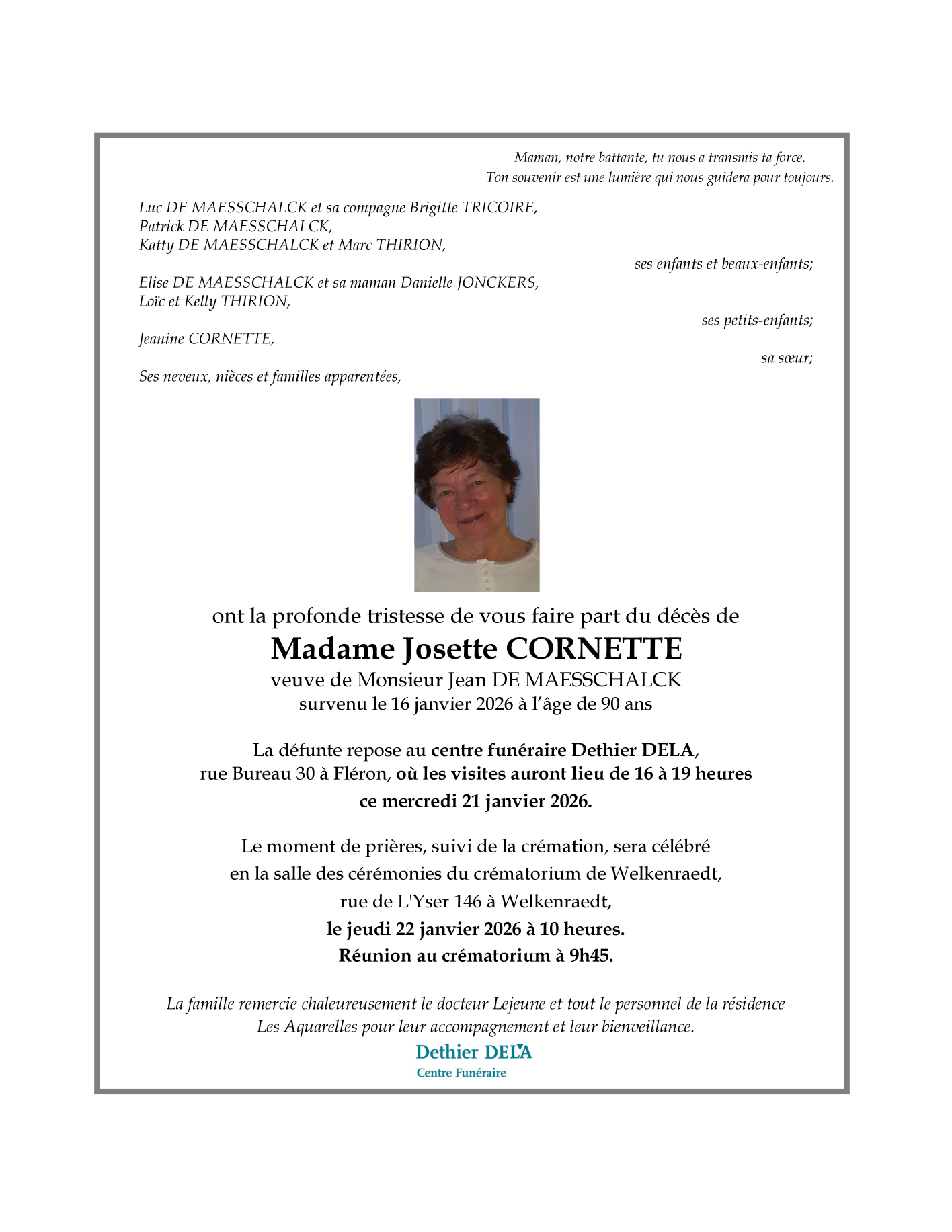 Décédée à Soumagne (4630) le vendredi 16 janvier 2026 à l'âge de 90 ans