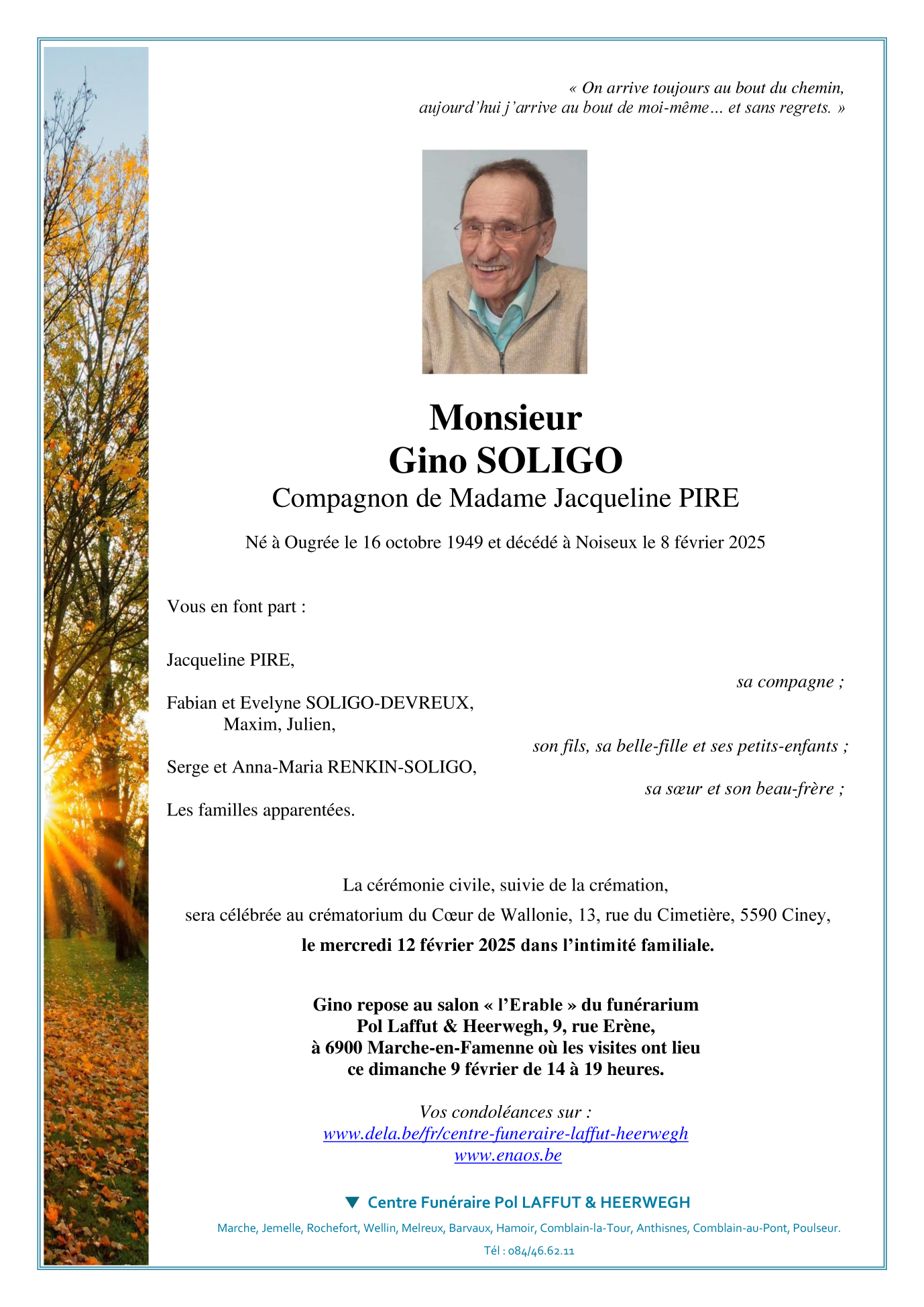 Décédé à Noiseux (5377) le samedi 8 février 2025 à l'âge de 75 ans