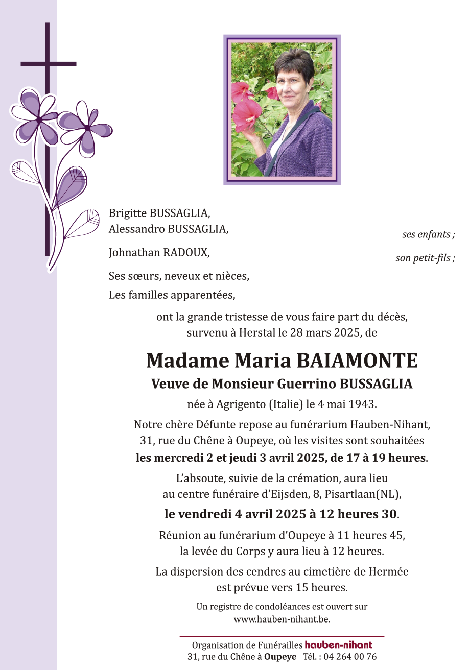 Fallecida en Herstal (4040) el viernes, 28 de marzo de 2025 a la edad de 81 años