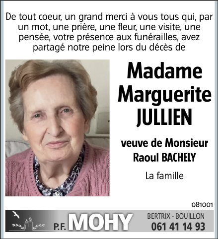 Décédée à Bertrix (6880) le lundi 9 décembre 2024 à l'âge de 91 ans