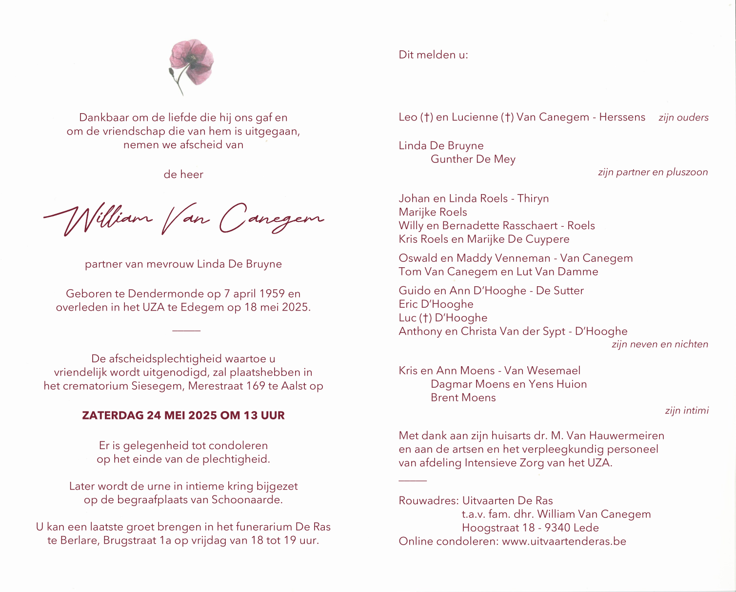 Décédé à Edegem (2650) le dimanche 18 mai 2025 à l'âge de 66 ans