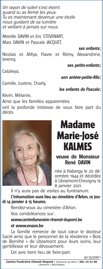 Fallecida en Libramont-Chevigny (6800) el viernes, 8 de enero de 2021 a la edad de 76 años