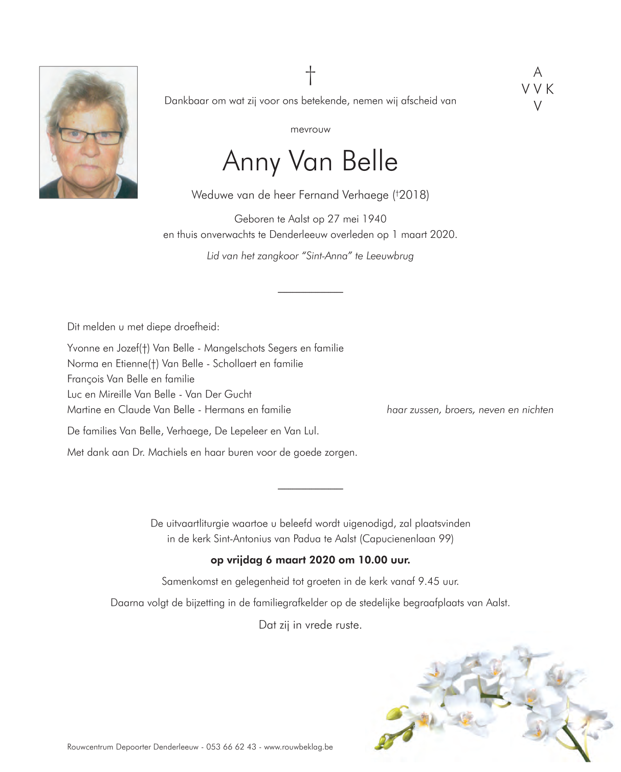 Décédée à Denderleeuw (9470) le dimanche 1 mars 2020 à l'âge de 79 ans