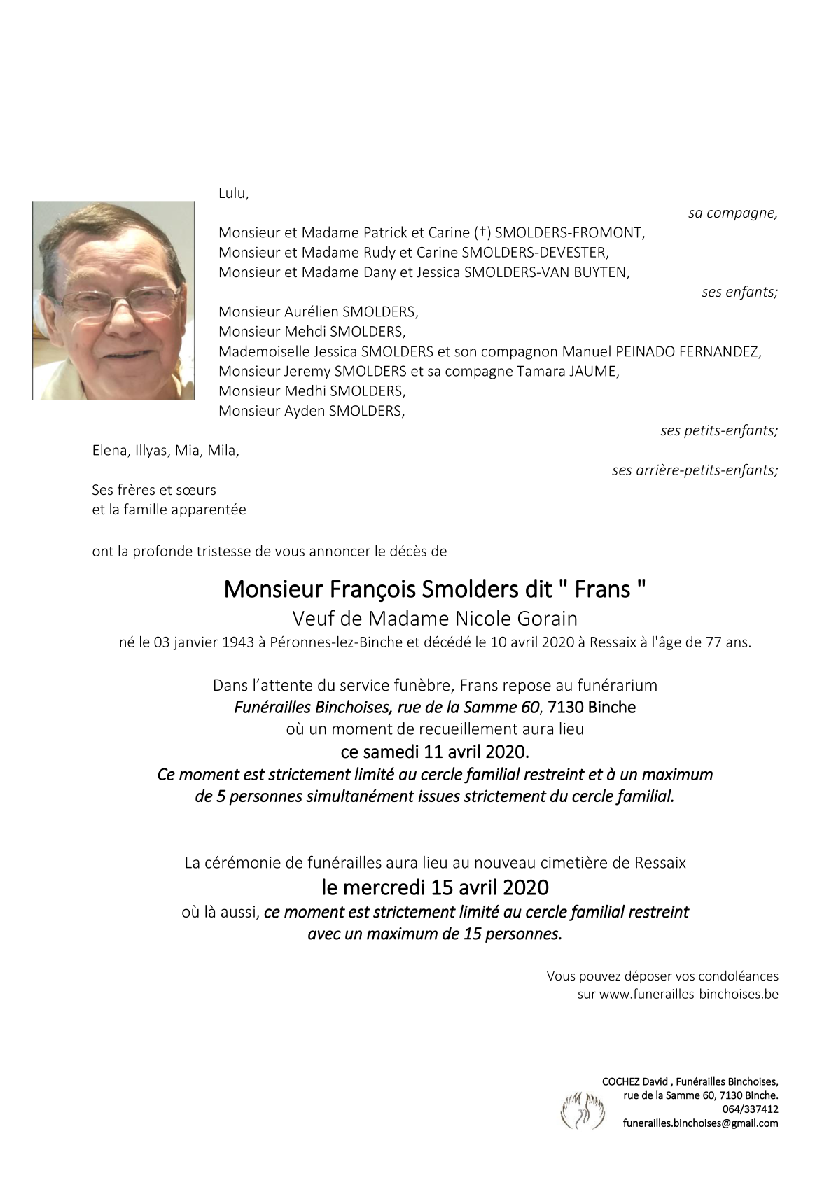 Décédé à Ressaix (7134) le vendredi 10 avril 2020 à l'âge de 77 ans