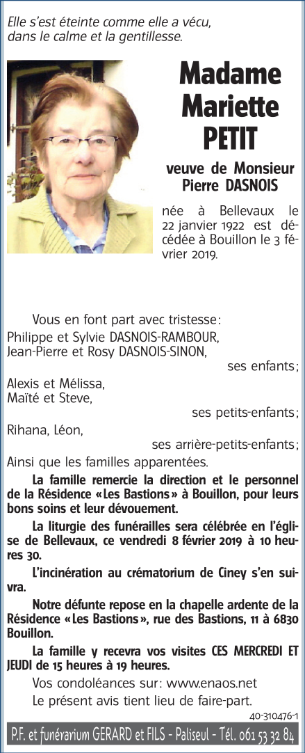 Fallecida en Bouillon (6830) el domingo, 3 de febrero de 2019 a la edad de 97 años