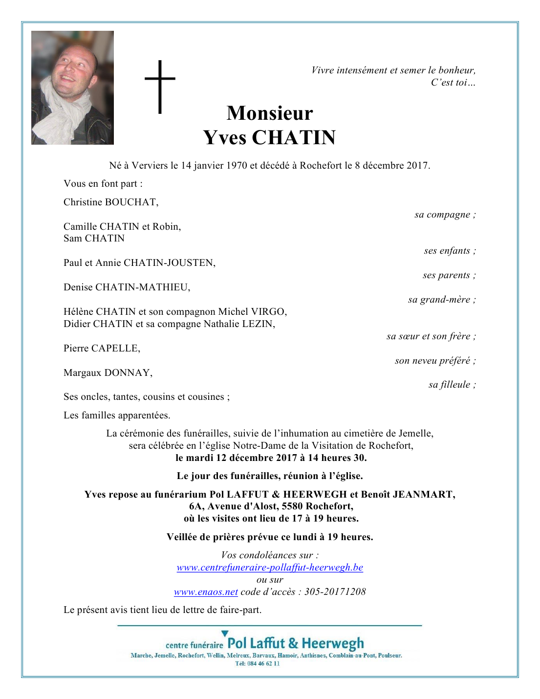 Fallecido en Rochefort (5580) el viernes, 8 de diciembre de 2017 a la edad de 47 años