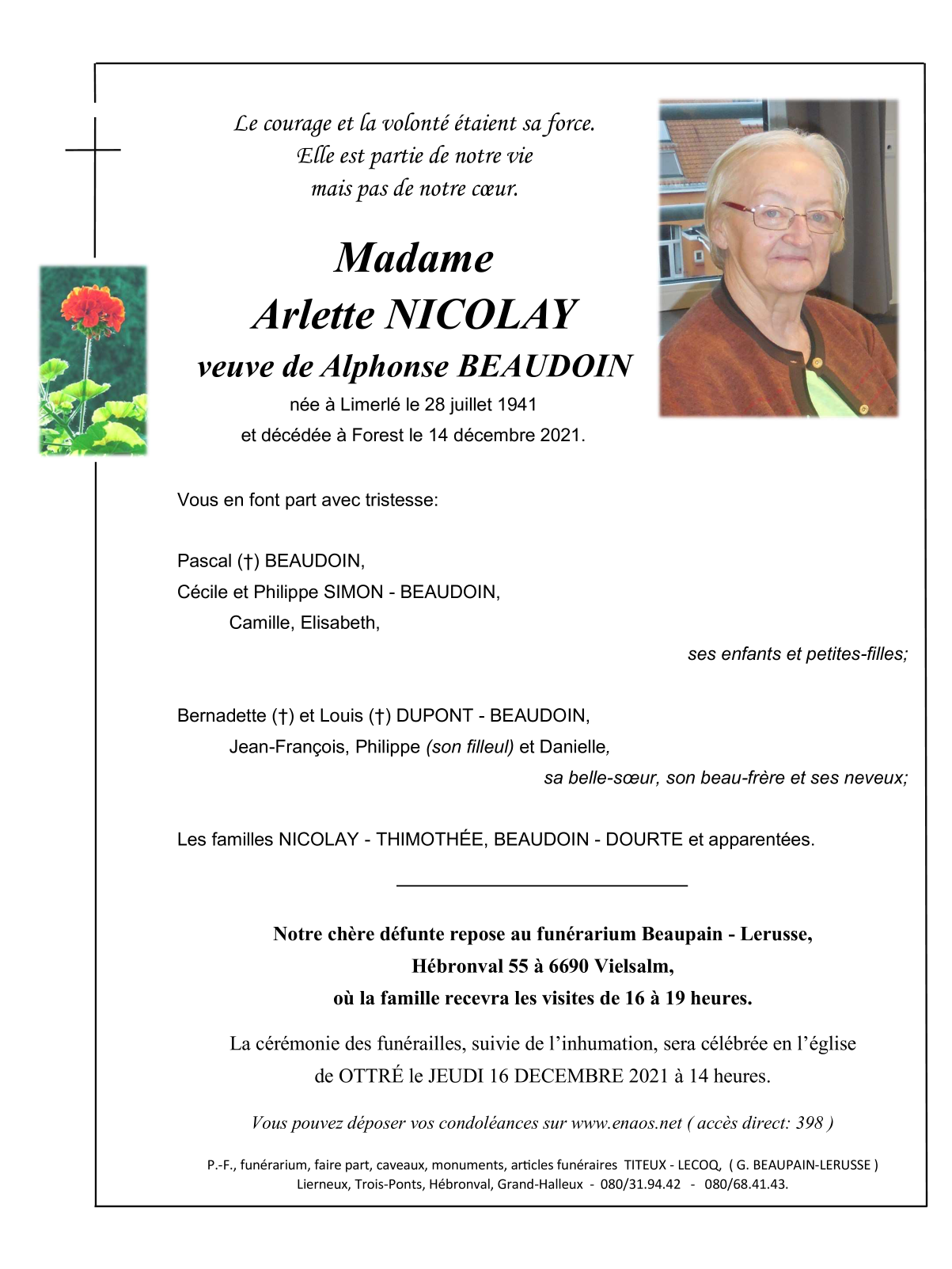 Née à Limerlé (6670) le lundi 28 juillet 1941