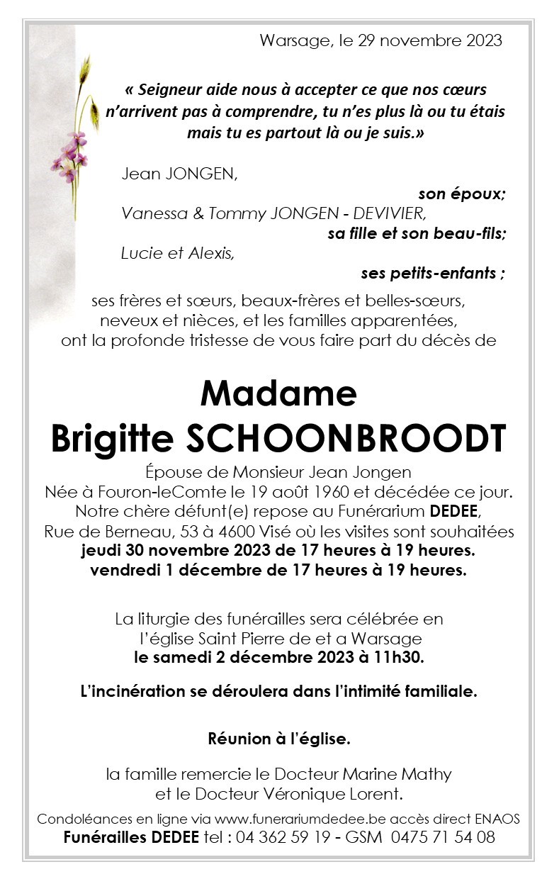 Décédée à Warsage (4608) le mercredi 29 novembre 2023 à l'âge de 63 ans