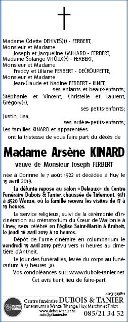 Décédée à Huy (4500) le lundi 15 avril 2019 à l'âge de 96 ans