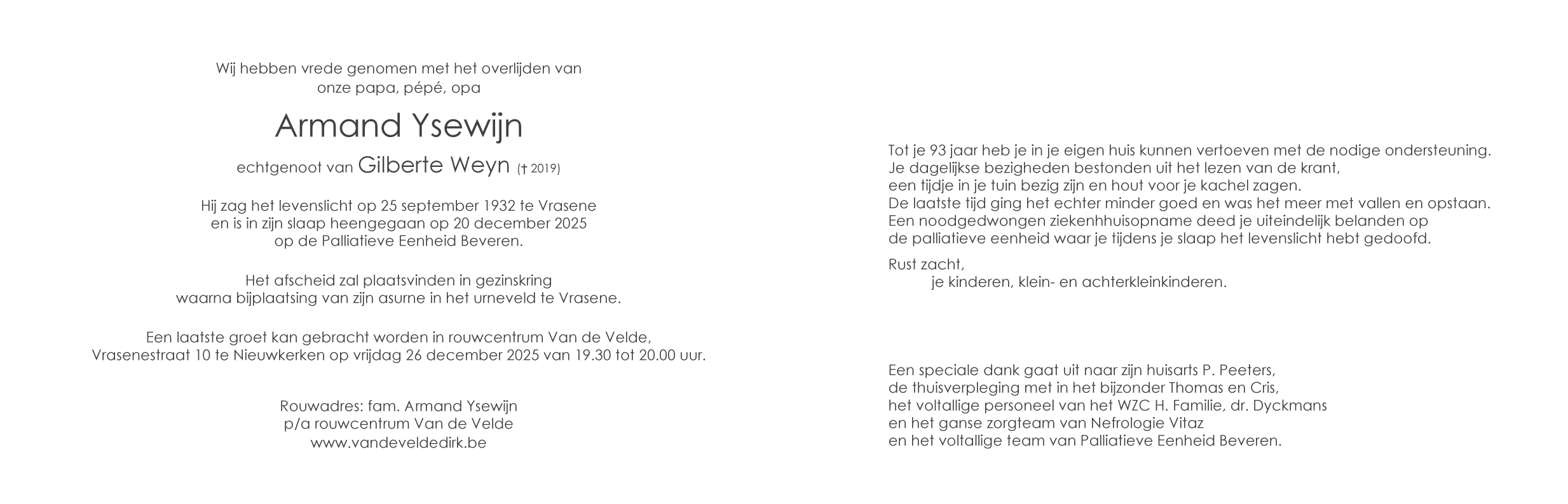 Décédé à Beveren-Waas (9120) le samedi 20 décembre 2025 à l'âge de 93 ans