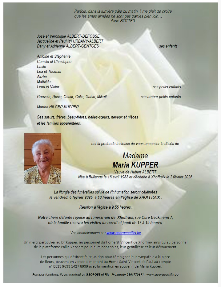 Madame Maria KUPPER veuve de Hubert ALBERT