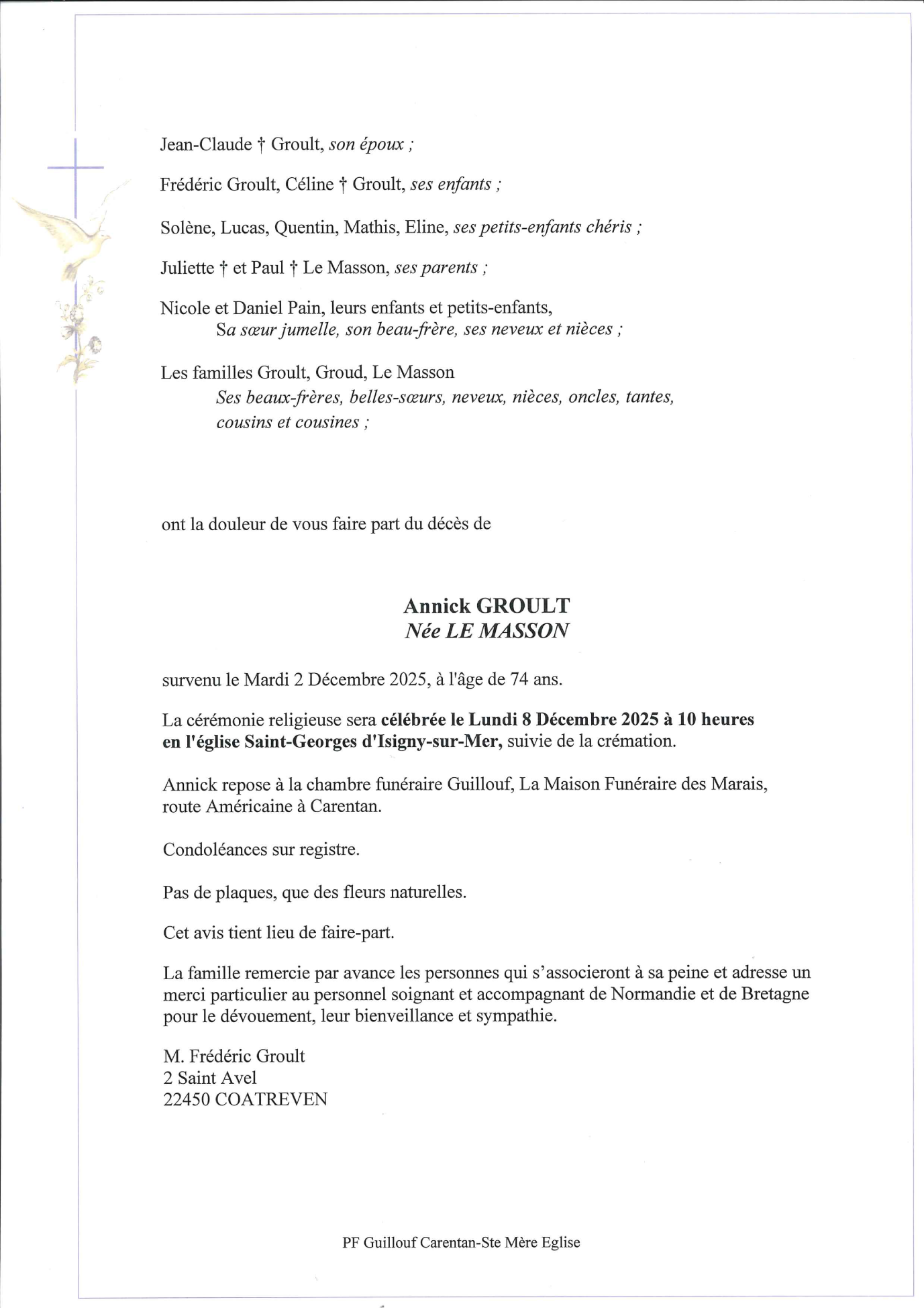 Veuve de Monsieur Jean-Claude GROULT